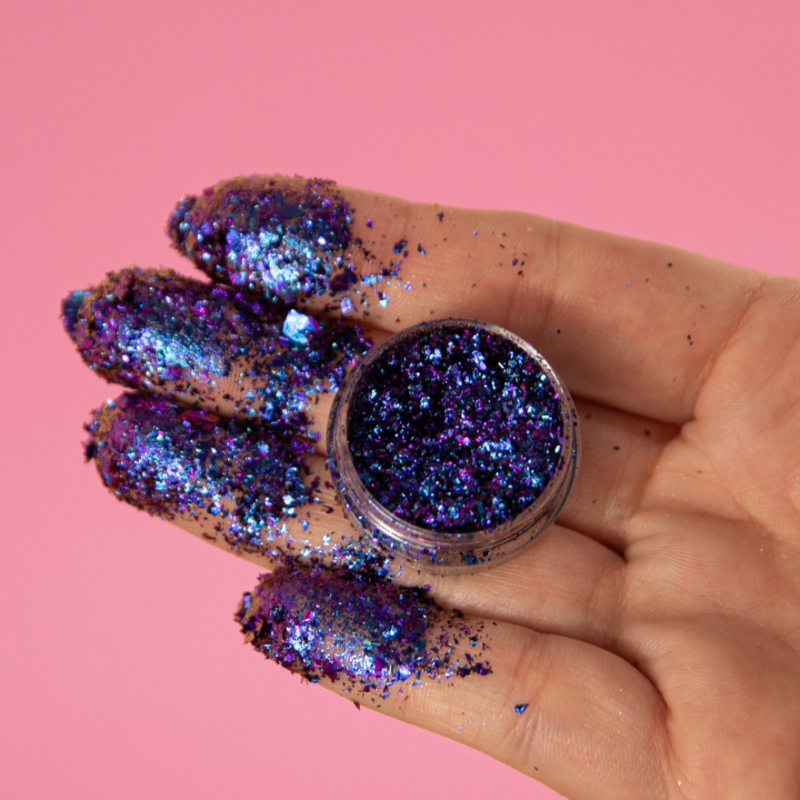 Partícula de brillo, hojilla metálica, multicromatica, camaleonica. Adquiere diferentes tonalidades dependiendo del ángulo de la luz. Particula de 10-2000 micras. Debe de ser utilizado sobre una base adhesiva (recomendado el pegante de pigmentos Naba), ya que mejora su adherencia y es trasparente, por ende, no altera el color. Contenido: 2-4 GR segun densidad.